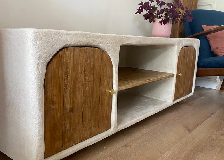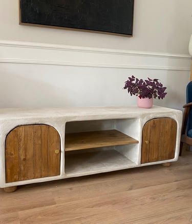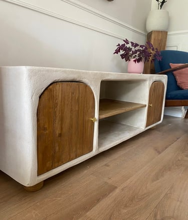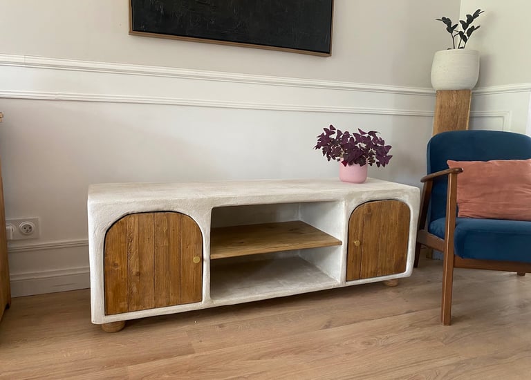 Meuble TV sur mesure. Piétements, portes et étagère en pin - Dimensions : 150x50x45
